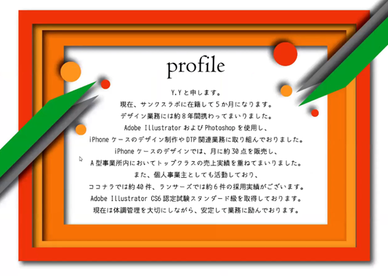 出島オフィス所属のYさんは在籍5か月。デザイナーとしてのキャリアは8年に及び、IllustratorやPhotoshopを自在に操るベテランです。