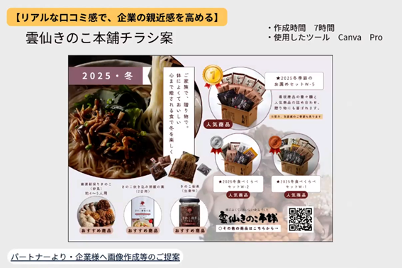 - 飲食店様: チラシからInstagramへの導線を設計し、来店前の不安を払拭する仕組みを提案。